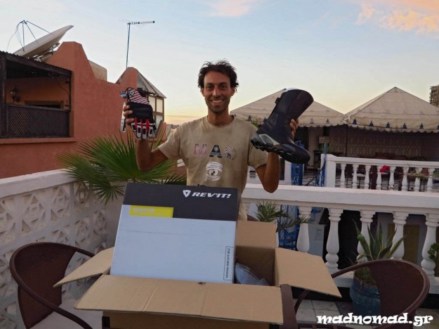 Στο Marrakesh ήταν ευκαιρία ν’ αλλάξω τις μπότες και τα γάντια μου. Είχα ξεκινήσει με τις μπότες που φορούσα στην Ασία, αλλά διαλύθηκαν μετά από τόσα χιλιόμετρα. H REV’IT! ανέλαβε να μου στείλει στο Μαρόκο τις απίστευτα άνετες μπότες Apache και τα γάντια Neutron, που έχουν μια μαγική δυνατότητα: λειτουργούν με οθόνες αφής! Δε χρειάζεται πια να σταματώ και να βγάζω τα γάντια μου κάθε φορά που χρειάζεται να χειριστώ μέσω του κινητού τη βιντεοκάμερα, τη μουσική, το GPS κ.λ.π..