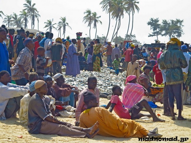 Ύστερα επισκεφτήκαμε το ψαροχώρι του Kayar, όπου είδαμε εκατοντάδες πολύχρωμες πιρόγες στην αμμουδιά κι άλλες τόσες μέσα στη θάλασσα! Είχαν στοίβες από ψάρια, που μόλις τα ξεφόρτωναν. Δε χάσαμε την ευκαιρία ν’ αγοράσουμε μερικά για την οικογένεια που μας φιλοξενούσε. Τα ψάρια είναι η πιο οικονομική τροφή στη Σενεγάλη, οπότε οι περισσότεροι τρέφονται καθημερινά μεσημέρι-βράδυ με ρύζι, ψάρι και λαχανικά. Το μενού είναι σχεδόν πάντα το ίδιο. Τουλάχιστον έχουν κάποια τροπικά λαχανικά και φρούτα, που χρησιμοποιούν για σάλτσες και νοστιμεύουν το φαγητό.