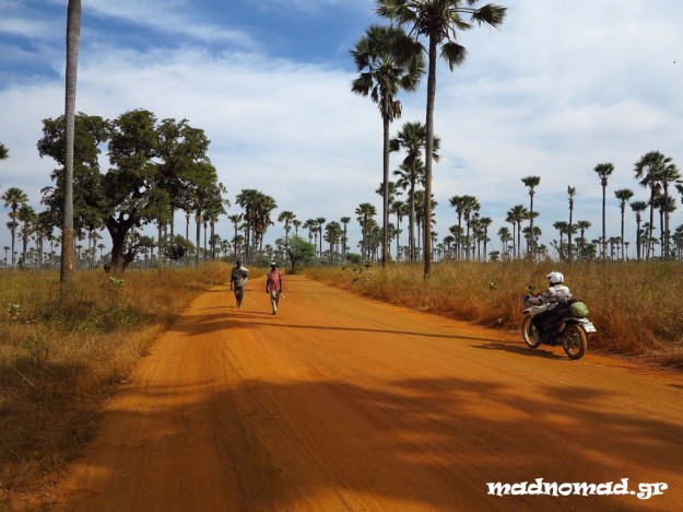 Παρόλ’ αυτά, απολαύσαμε πολύ τη διαδρομή, αφού το τοπίο ήταν πολύ ενδιαφέρον! Όταν ακούτε για την τροπική Αφρική, τι εικόνες σας έρχονται στο μυαλό; Ακριβώς αυτές αντικρίζαμε για πρώτη φορά: πυκνή βλάστηση με πανύψηλους φοίνικες, πανέμορφα μπαομπάμπ, εντυπωσιακά δέντρα καπόκ, ποτάμια, λίμνες, πολύχρωμα, εξωτικά πουλιά και τεράστιες σαύρες! Ανάμεσα σ’ αυτή τη ζούγκλα ήταν σπαρμένες κυκλικές καλύβες φτιαγμένες από λάσπη με αχυρένια στέγη. Φιλικοί χωρικοί περπατούσαν ή κινούνταν με τα ποδήλατά τους ανάμεσα στους οικισμούς, ενώ οι γυναίκες κουβαλούσαν τα πράγματά τους ισορροπώντας τα με περίσσια χάρη πάνω στο κεφάλι τους.